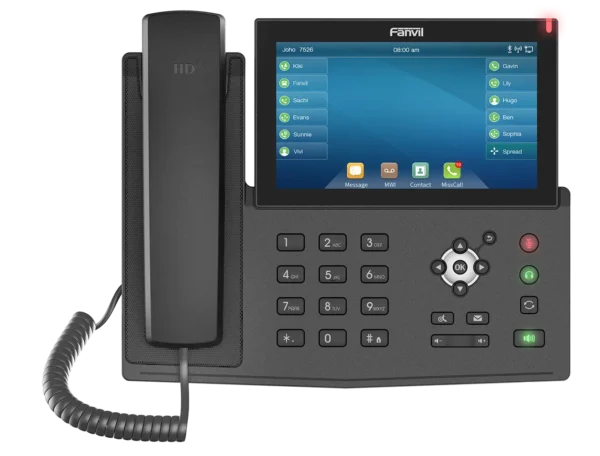 View ProductHigh-end Touch Screen IP phone. Gigabit(10/100/1000Mbps), 20 SIP lines,7 inch capacitive touch screen; Support 6-way audio conference; Built-in Bluetooth for connecting Bluetooth headset; Wi-Fi connectivity(Via Wi-Fi dongle); Up to 127 DSS keys entries available at the display; Video Codec H.264 support for receiving video calls. Support Fanvil SIP hotspot function